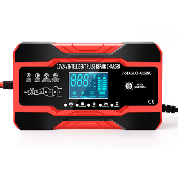 E-FAST 12V 24V 12A 6A Battery Charger 7-Stage Charging LCD Display Red for Motorcycle Car Gel AGM LiFePO4 Lead-Acid Battery